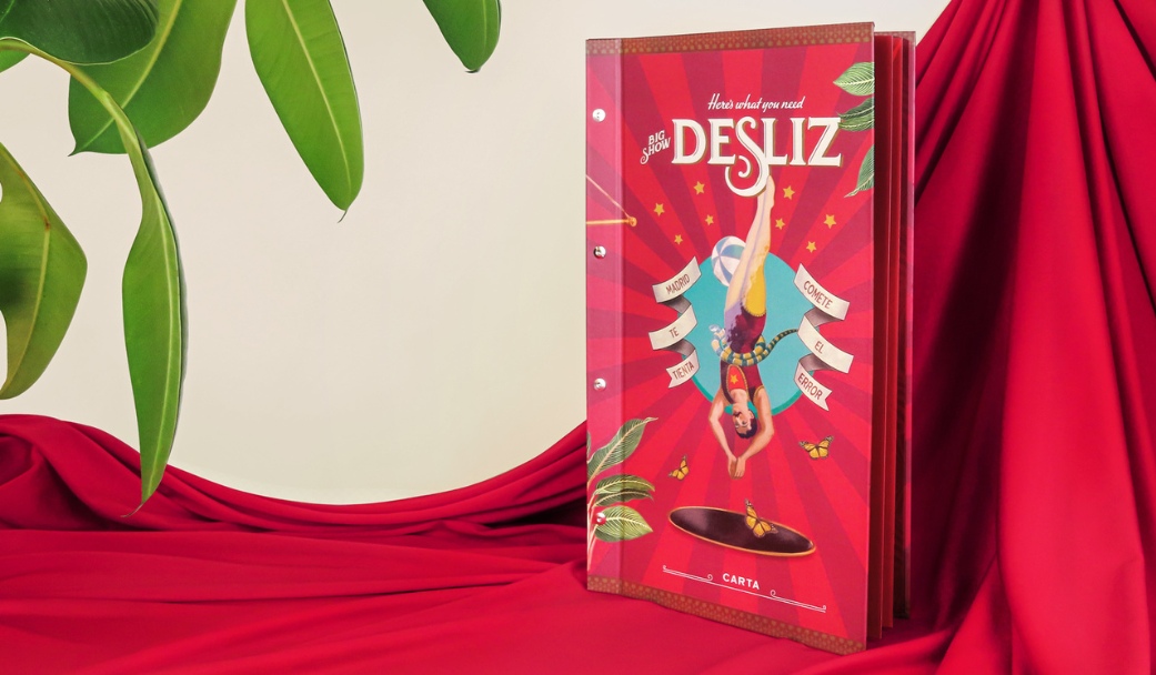 Esta impresionante carta restaurante lomo visto se ha impreso para un restaurante de cena con espectáculo. En la cubierta se ha aplicado barniz selectivo para resaltar con brillo zonas de la gráfica. Para potenciar el carácter espectacular de esta propuesta gastronómica, las páginas interiores se han impreso a todo color sobre el papel blanco perlado Sitio Pearl Ice White con una maquetación propia de un malabarista y estética circense.