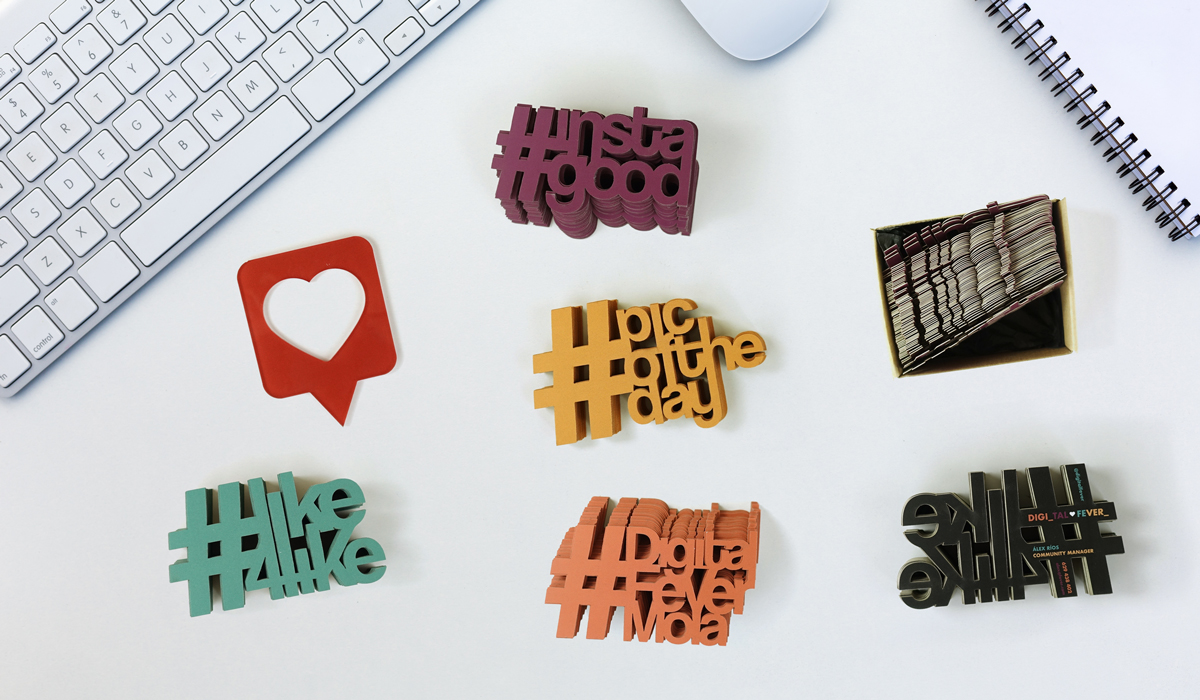 Estas inusuales tarjetas de visita en forma de hashtag están diseñadas para Digital Fever, una agencia de Social Media y Marketing Digital ficticia. Además, están impresas con los colores corporativos que componen el logotipo, sin necesidad de recurrir a las costosas tintas Pantone. Mediante la impresión con siete tintas (CMYK + Orange + Violet + Green), es posible simular de manera muy muy precisa un color plano concreto a menor precio que las costosas tintas planas. Para la impresión se ha elegido un papel estucado de 400 g con plastificado mate, el gramaje es importante en este caso para que las tarjetas no parezcan endebles tras troquelarlas. El resultado son cuatro tarjetas de visita que captarán la atención de su receptor de un solo vistazo, además de ser irresistiblemente instagrameables, el objetivo perfecto para este tipo de empresa.