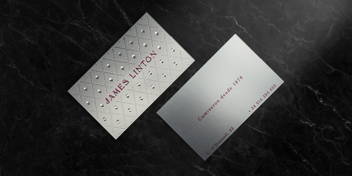 Los acabados imprimen estilo a la pieza, le añaden valor y refuerzan la imagen de marca. Esta tarjeta de visita, pensada para una supuesta camisería de alta costura, se ha impreso sobre un papel estucado idóneo para el acabado de laminado metalizado, un plastificado que metaliza la impresión. A continuación, se le ha aplicado barniz selectivo con dimensión 3D Plus para el patrón que simula el bordado de una camisa y la tipografía del logotipo. Todo el conjunto metalizado con relieve comunica la imagen de una firma de lujo de alta calidad. Además, de los acabados, la selección de los colores asociados la lujo como el plateado o el granate es relevante para no caer en contradicciones.