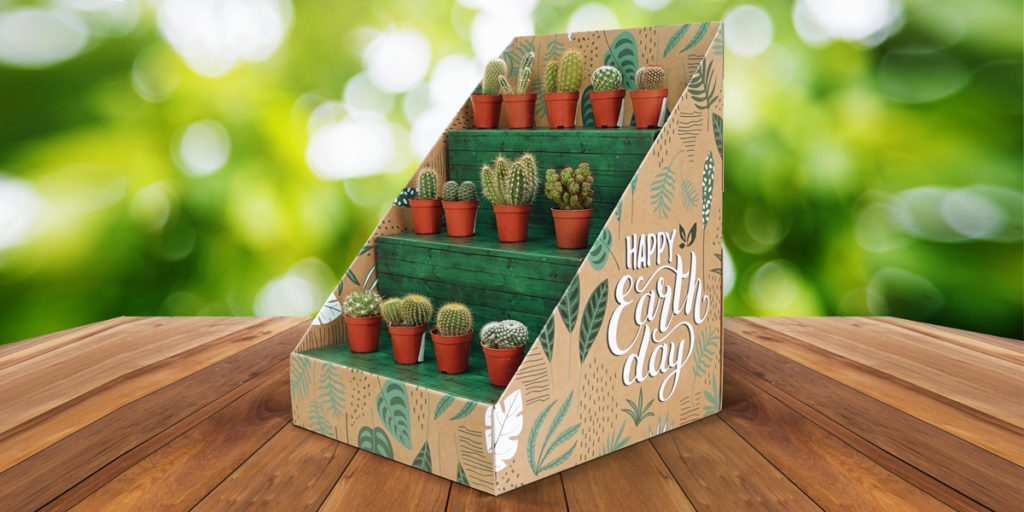 Con motivo del Día de la Tierra, se ha ideado una ficticia campaña de sensibilización medioambiental de mano de una empresa de jardinería que destinará los fondos recaudados al cuidado del medio ambiente, una forma solidaria de promocionarse, mejorar la imagen de marca y aumentar la notoriedad. Para ello, se ha diseñado un expositor de mostrador con un tótem que complementa al estand con un mensaje y, además, su altura de 1,80m sirve como reclamo. La llamativa gráfica no puede dejar indiferente a nadie que pase por delante gracias a la combinación de tinta blanca sobre el soporte de cartón corrugado en color kraft. La tinta blanca también está aplicada como base para opacar los colores.