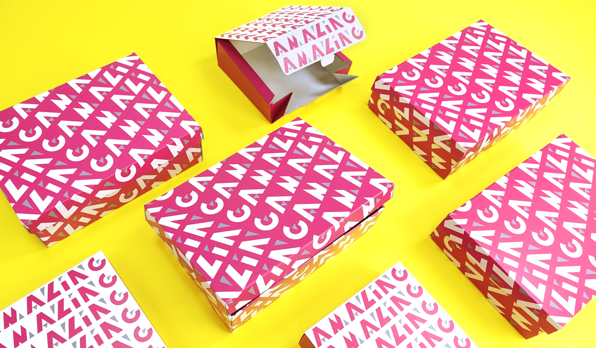En este caso, se ha elaborado una invitación muy llamativa para la presentación de la nueva colección de AMAZING, algo que se le enviaría a influencers. Su diseño, que obliga a la interacción, complementado con los acabados, la tinta y el papel elegido, tiene el éxito asegurado. Esto mismo podría hacerse con un formato más común, un papel estucado de calidad y colores llamativos, pero la relevancia de marca y la diferencia competitiva están en los pequeños detalles. La invitación consta de dos partes: una faja impresa con tinta rosa flúor con reservas del papel en blanco y las partes del logotipo que corresponderían al Pantone Cool Grey troqueladas con láser HD para mostrar el tarjetón del interior, también impreso sobre un estucado mate pero con acabado de laminado metalizado, una manera diferente de conformar el logotipo. Todo el conjunto se merece un unboxing.