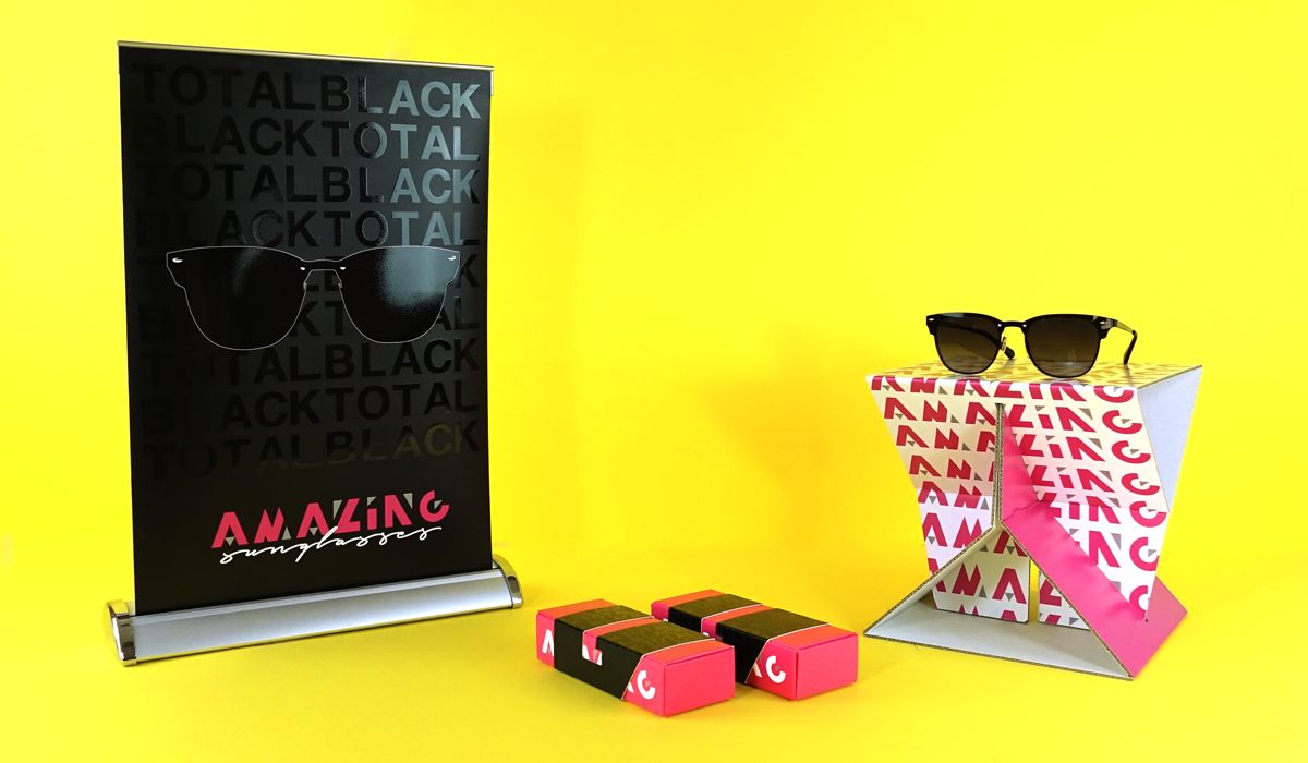 Para esta ficticia edición limitada de gafas, se ha personalizado la faja de la caja regular. La campaña se llama TOTAL BLACK y, simplemente, se ha utilizado un diseño tipográfico en negro potenciado con barniz selectivo en dimensión 3D, lo que aporta brillo y volumen a cada letra. Además, la faja funciona como soporte de las gafas, un valor añadido más. El diseño rompe con la estética habitual que se complementa con la caja, totalmente asociable a la marca y que está impresa a partir de la Carta de Color simulación Pantone, un catálogo de colores Pantone posibles de reproducir de forma muy precisa y más económica a través de la impresión con seis tintas (CMYK + Orange + Violet).