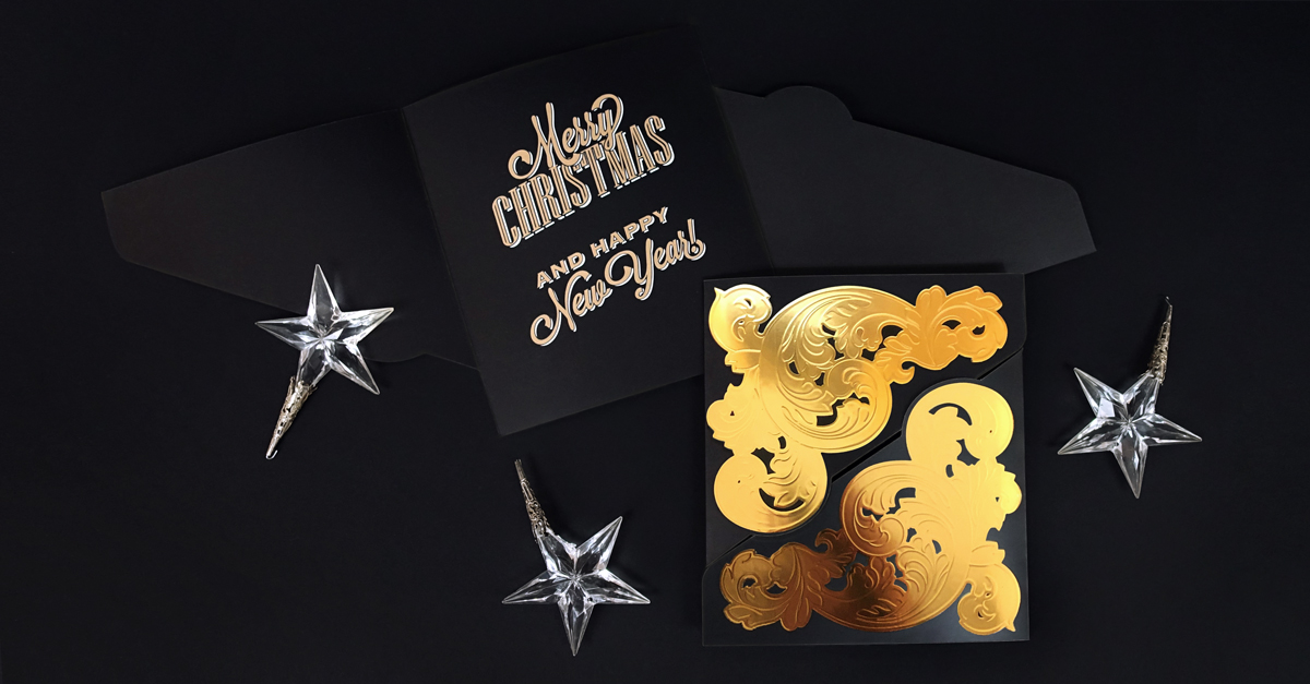 Los acabados de alta definición también nos permiten superponer capas de estampado digital y barniz selectivo. Es el caso de este elegante díptico con una apertura acorde a la estética. Está impreso sobre un papel estucado mate que contrasta con las volutas doradas con efecto metalizado gracias a la capa de estampado digital de color oro en dimensión 2D como base y reforzada con el brillo y el volumen que supone la capa de barniz selectivo 3D por encima. Esta elegante composición da acceso al mensaje navideño, lo que convierte este díptico en una felicitación de lujo.