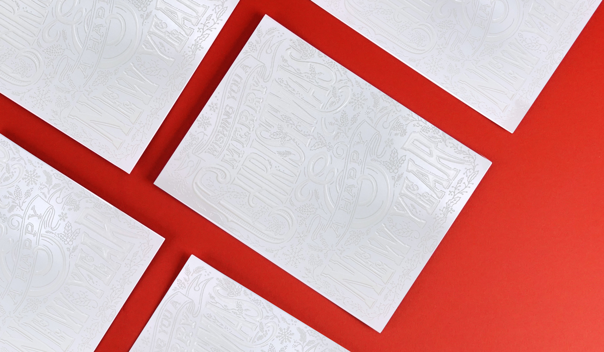 Este curioso tarjetón de Navidad está impreso sobre el soporte sintético de PVC ecológico con plastificado mate y sin una gota de tinta, los dibujos y las tipografías están compuestas únicamente gracias a la aplicación de barniz selectivo. A través de la combinación de dos capas de barniz 2D + 3D se crea el volumen suficiente para destacar cada letra y cada elemento de la composición. Es un recurso muy sorprendente al tacto, cada detalle de la creatividad, por pequeño que sea, está perfectamente impreso y definido; y a la vista, es totalmente legible en función de la incidencia de la luz, implica directamente al receptor ya que necesita de su interacción para hacerlo visible.