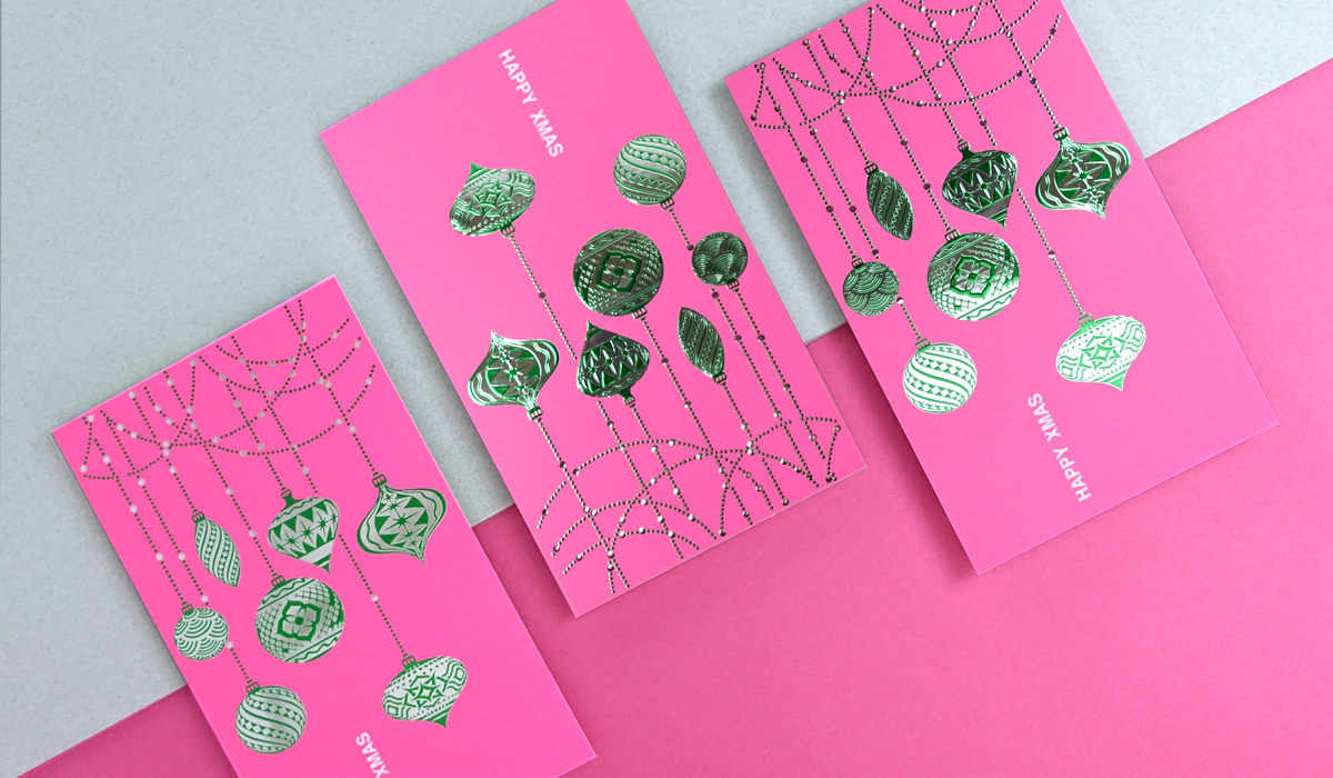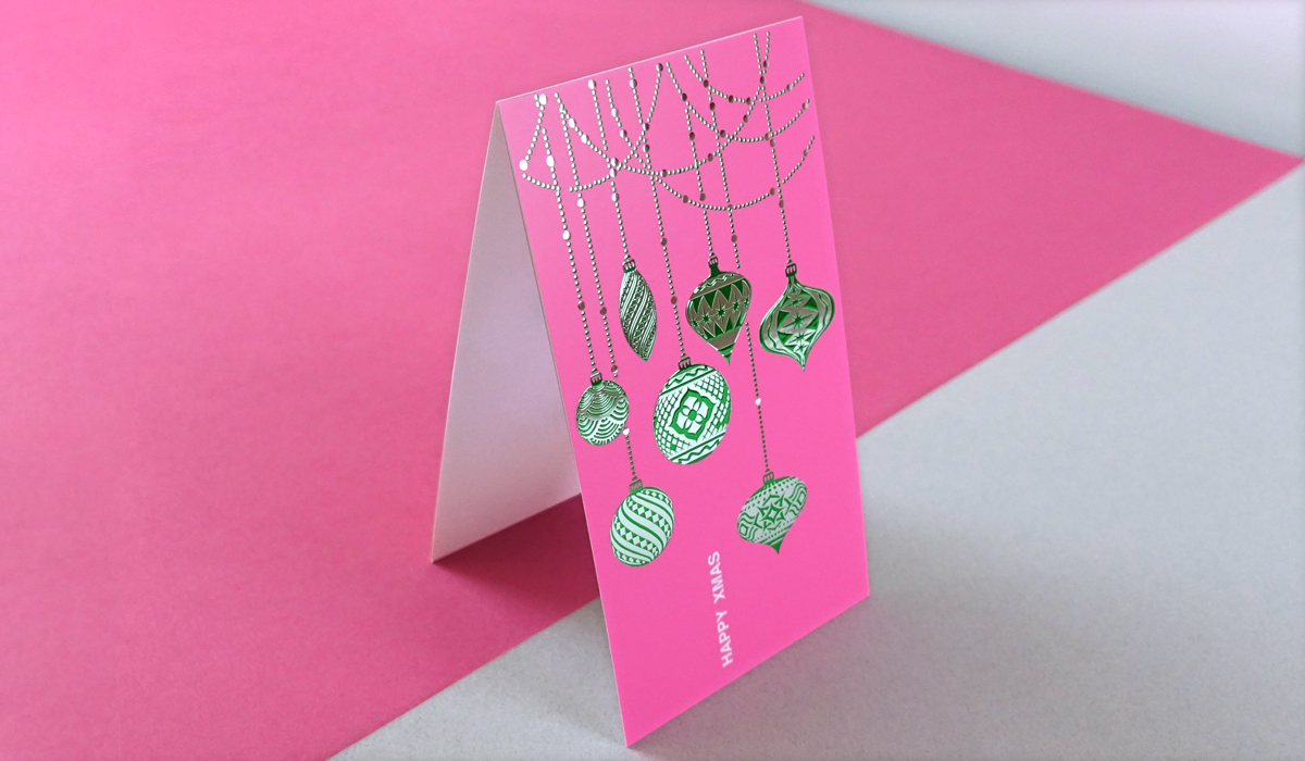 En consonancia con la estética navideña de luces y adornos con colores brillantes, se ha impreso esta tarjeta navideña sobre un papel estucado mate en color rosa que contrasta con el efecto ultrametalizado que resulta de la combinación de dos colores de estampado digital en la misma área del diseño.