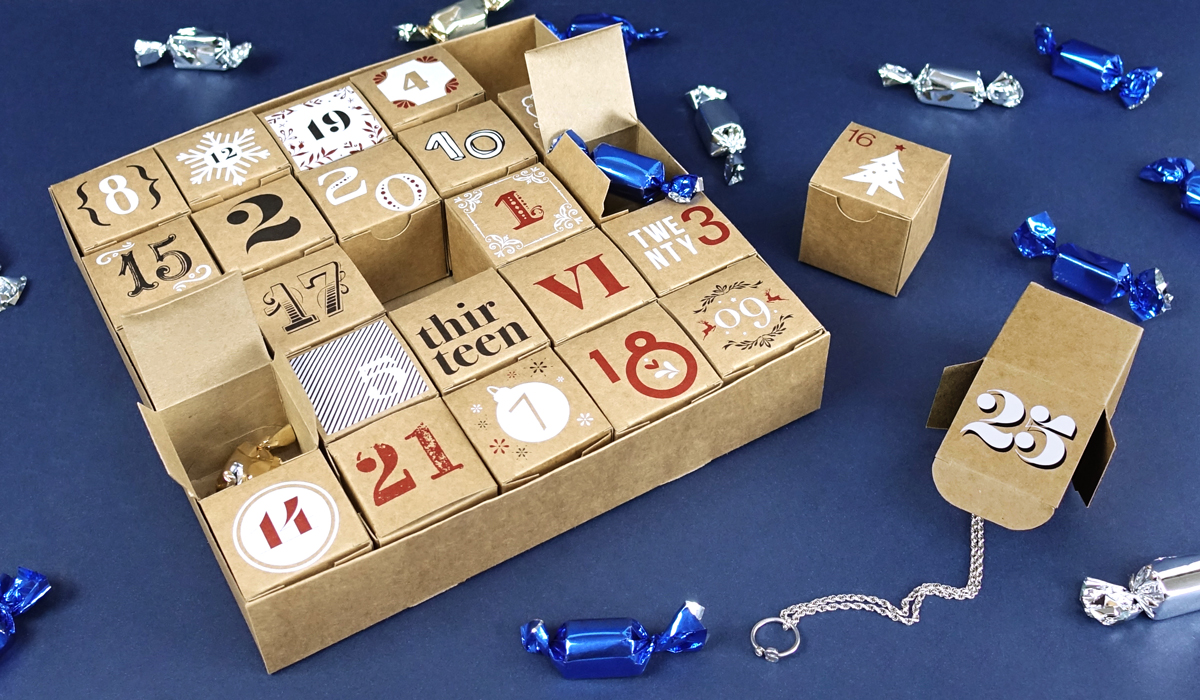 Este calendario de adviento está conformado por 25 cajitas cubo impresas sobre soporte kraft y personalizadas cada una de ellas con tinta blanca en bruto o como base para opacar las tintas CMYK. Todas ellas se agrupan en una caja sin tapa también de soporte kraft. Se trata de un calendario de adviento con mucha personalidad que sigue la estética navideña con los colores como hilo conductor, pero que tiene el carácter propio de esta supuesta marca millennial de joyería. Esta pieza sirve tanto para regalo de empresa como para comercializarlo, es una manera muy peculiar de hacer un regalo: cada cajita contiene un dulce a excepción de la correspondiente al día de Navidad que alberga una joyita.