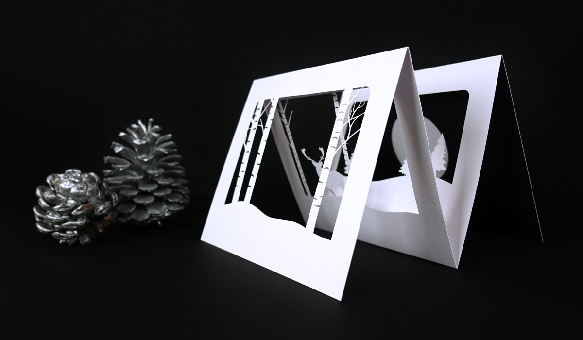 El christmas felicitar la Navidad está formado por un cuadríptico plegado en vertical: Las tres primeras paletas están troqueladas con láser Ultra HD, una herramienta de corte súper precisa; al plegarlo se forma un paisaje muy navideño.