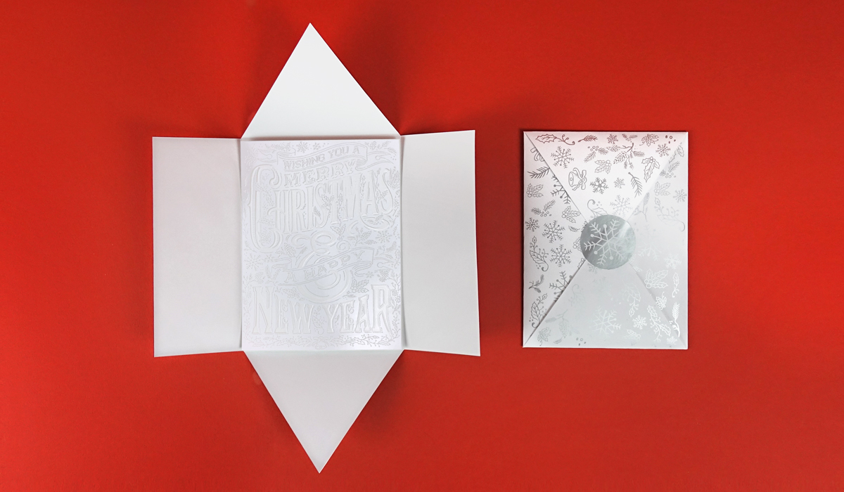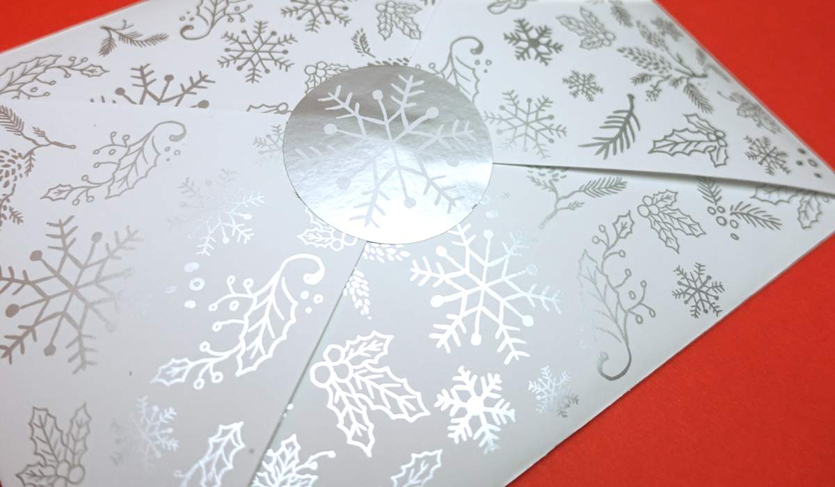 El tarjetón se ha acompañado con un envoltorio muy especial para incentivar la intriga del receptor: Se trata de una especie de sobre impreso con los mismos dibujos que tiene la felicitación sobre un papel estucado mate con tinta plata metalizada y un adhesivo brillo para sellarlo, también con tinta plata metalizada. Fantasía para Navidad.
